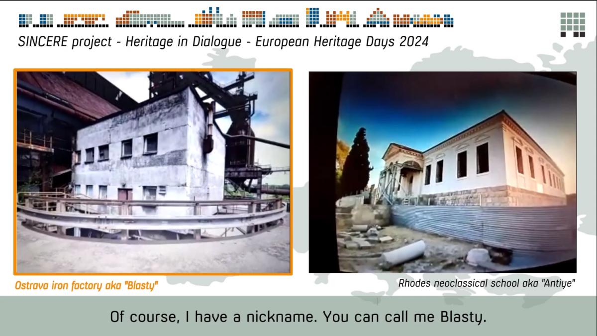 In the context of the European Heritage Days, the SINCERE project organized an online dialogue between the Neoclassical School in Rhodes (Greece) and the Museum+ in Ostrava (Czechia). This playful event took place on 27 September 2024 (see the original announcement), and it its success motivated the creation of the dedicated web site talkingbuildings.net.
